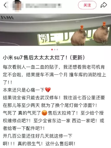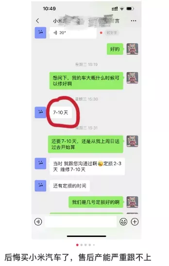 在社交平台搜索发现,确实有不少网友都在网络发帖称,小米汽车的售后服务跟不上。一小米车主发帖称,自己的车辆撞了,咨询官方却告知,全省只能去武汉修车!该车主吐槽,自己往返七百公里还要在那儿等至少两天 ,就为了换个尾灯做个漆面!还有网友发帖称:自己去到小米汽车上海的售后服务点。看到里面停满了待维修的小米汽车,售后工作人员都接待不过来了。自己的车是刮蹭,需要喷漆,被告知喷漆需要10天,因为前面很多车在等着修,根本忙不过来。
