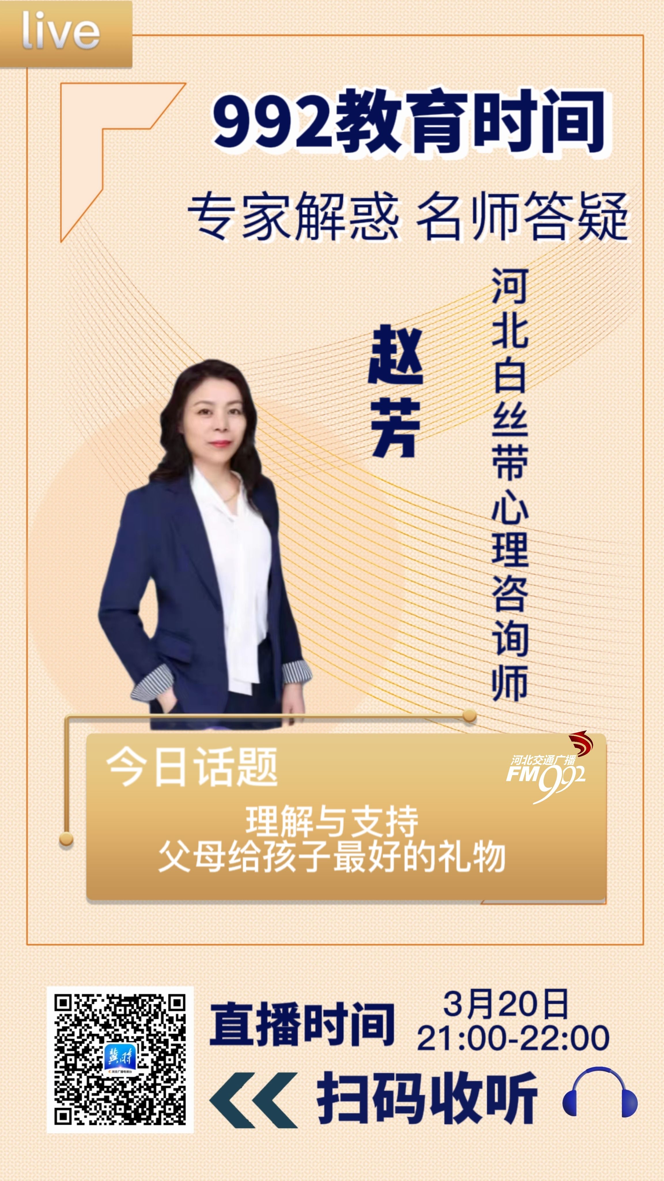 孩子有没有跟您说过这样一句话?你能不能理解我一下?为什么爸爸妈妈从来都不理解我?我想干什么他们都反对?为什么他们不能给我支持?谈到家庭教育,理解与支持是父母可以给我们孩子最好的礼物?那么如何做到这一点?今天我们的992教育时间栏目,特别邀请到河北白丝带心理咨询师、家庭教育心理顾问 赵芳老师做客节目,就“理解与支持——父母给孩子最好的礼物”这个话题跟大家聊一聊,有哪些需要我们学生和家长应该提前关注。如果您有相关的问题,也欢迎大家随时发送到河北交通广播的微信中,我们随时为您解答。