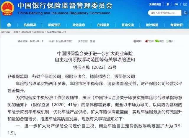 2022年12月30日,中国银保监会发布了一份通知(银保监规〔2022〕23号),旨在进一步扩大商业车险自主定价系数浮动范围等有关事项。