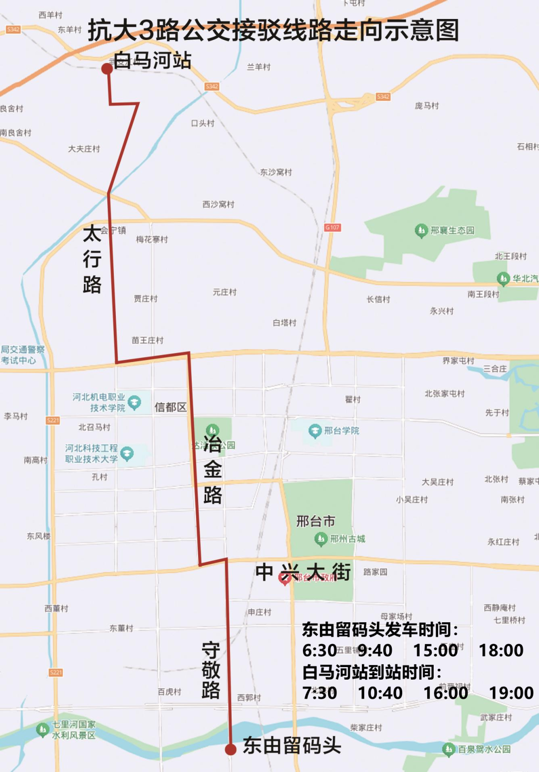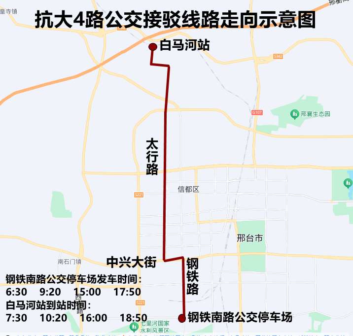 随着我市首条红色旅游专列“抗大号”开通后,红色文旅热度持续攀升,市民感受红色文化的热情空前高涨,为了进一步保障广大市民能够顺利出行,邢台公交于2025年9月21日起,开通由东由留码头、钢铁南路公交停车场至白马河站两条公交接驳线路,具体开通线路情况如下: