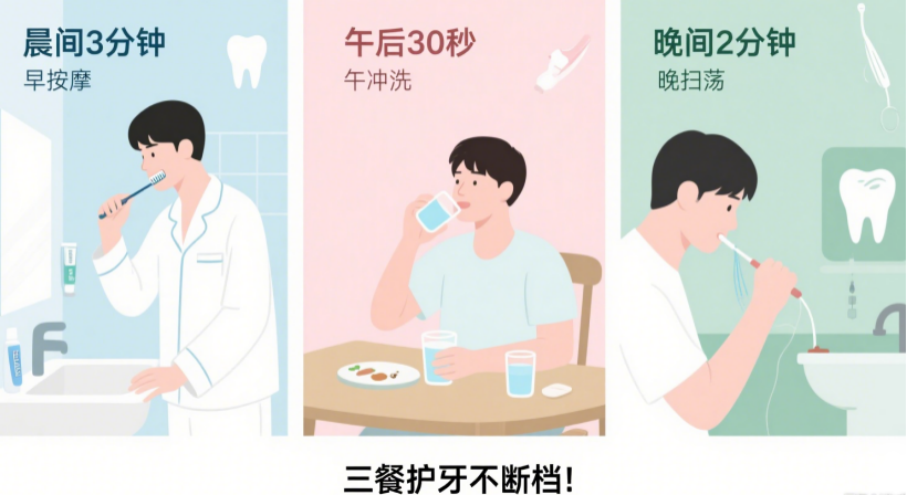 晚间2分钟:利用水牙线(冲牙器)清除食物残渣,把卡在缝里的“顽固分子”一网打尽。