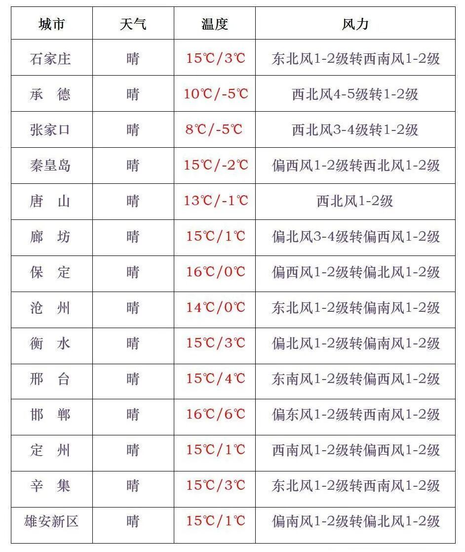 【大风降温】今天(11月9日)白天,张家口北部、承德北部晴间多云,其他地区晴,西北部地区会有4到6级的西北风,局地阵风可达9级左右,全省大部地区最低气温持续下降3到6度,部分地区降幅可达7到9度。石家庄晴,3~15°C;雄安新区晴,1~15°C;北京晴,0~14°C。