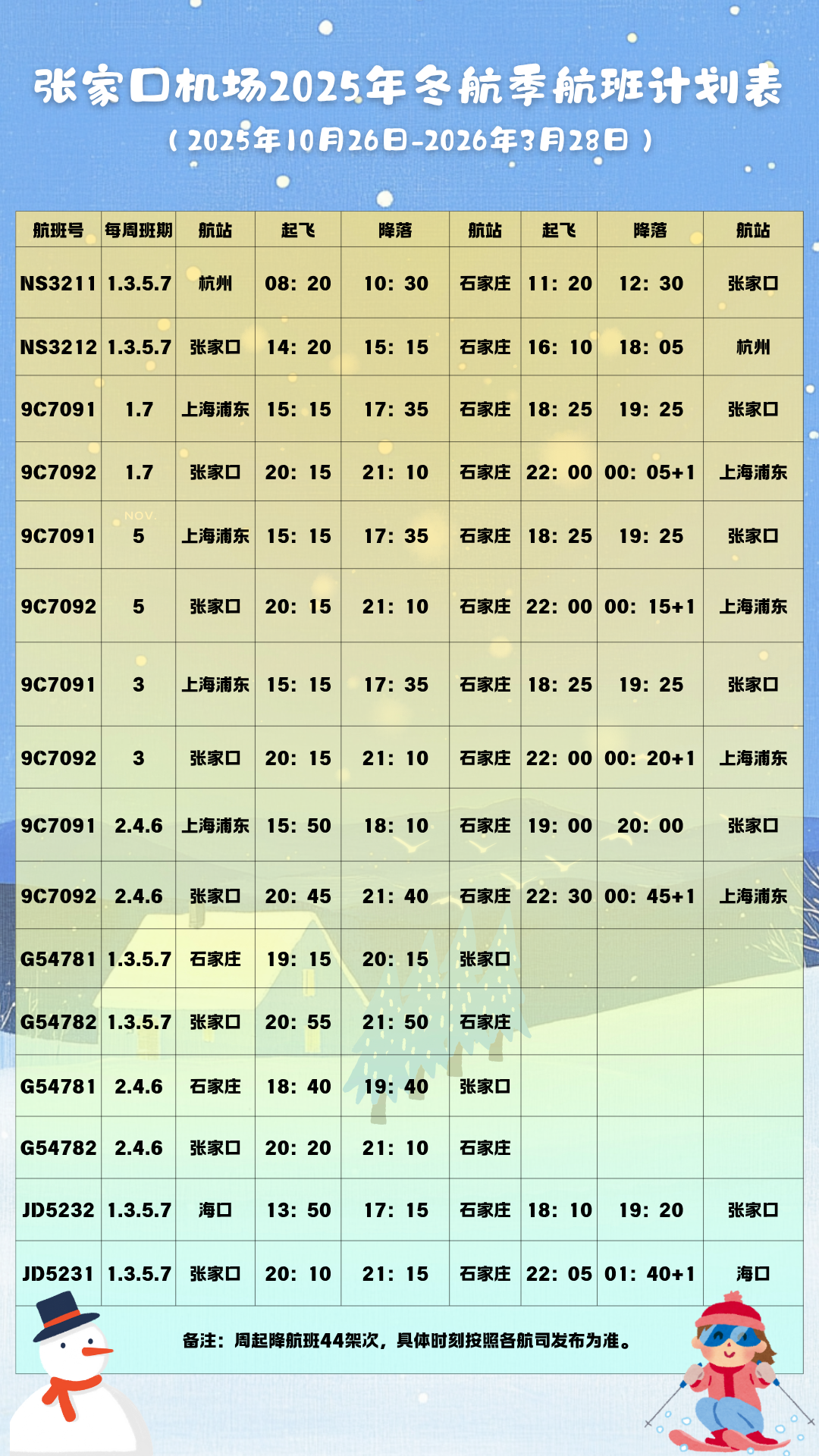 【护航冰雪之旅】冬航季期间,张家口机场新增首都航空执飞的张家口-石家庄-海口航线,每周一、三、五、日执行;华夏航空执飞的张家口-石家庄点对点航线,每日一班。