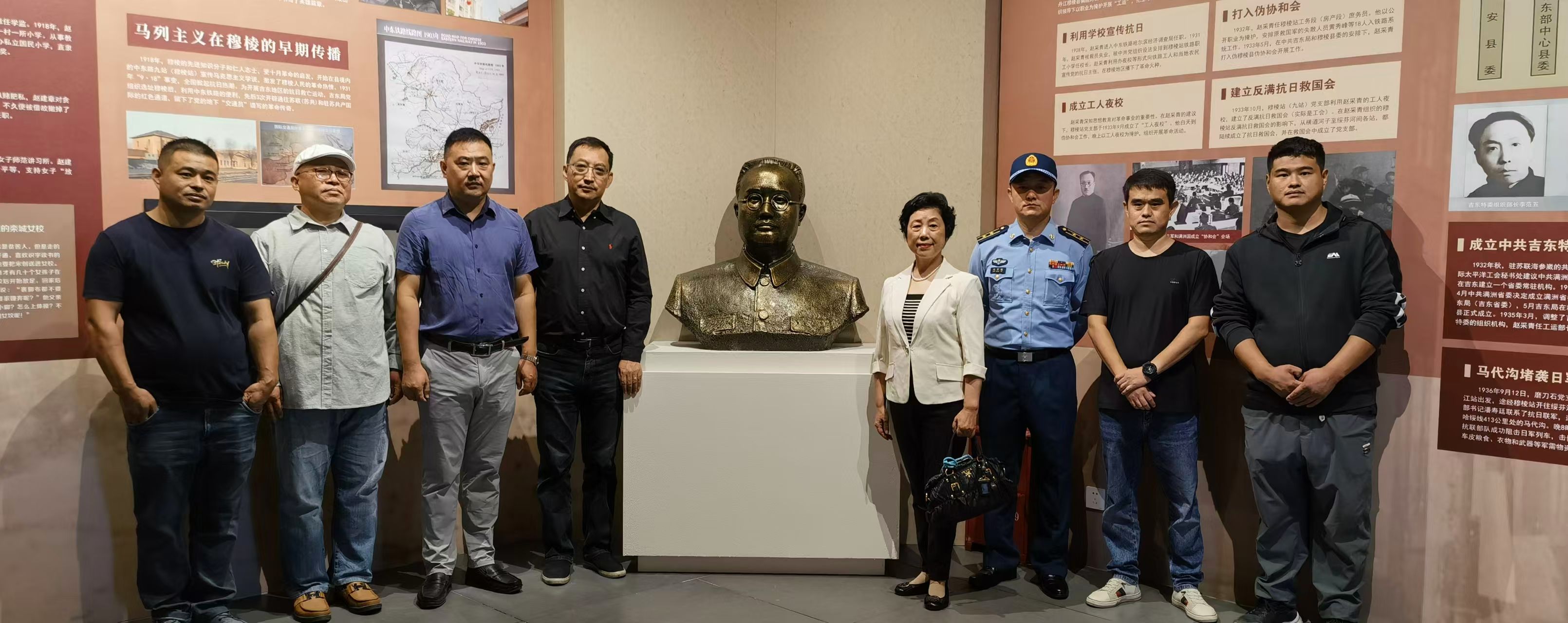 赵采青后人与其铜像合影