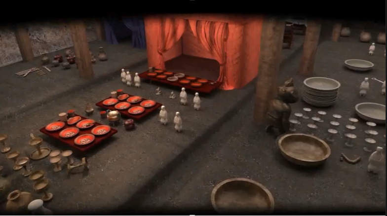 说唱俑:这里是宽敞的厅堂,陈设着两具幄帐,幄帐周围有侍俑,以及用来烹饪各种饮食的器具,殿下就是在这里招待客人的。