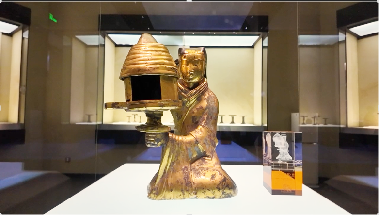 河北博物院 社会教育部 文博副研究馆员 贾叶青:在灯的内壁,刻有“长信”的字样,长信指的是当时的长信宫。而长信宫的主人是窦漪房窦太后,这个灯是长信宫使用的,所以它被命名为“长信宫灯”。