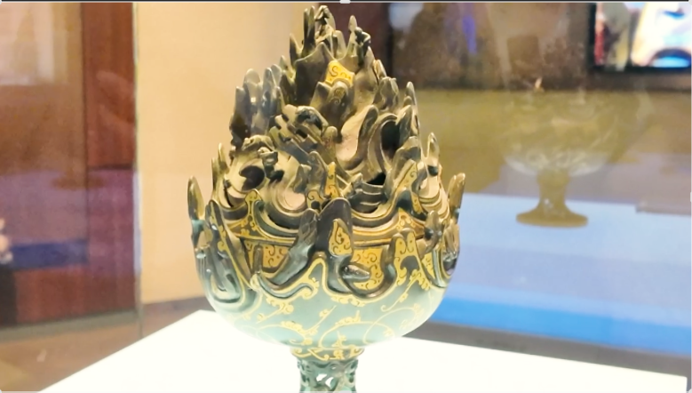 语音导览内容:我们眼前的是错金铜博山炉,是薰炉的一种。炉盖高而尖,铸成山峦重叠的模样。博山炉通体错金,纹饰自然流畅,金丝有粗有细,细的犹如毫发。