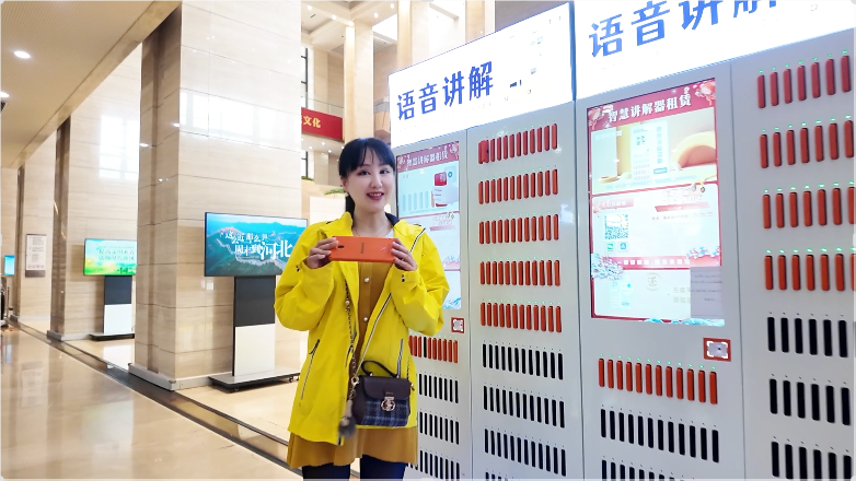 记者 毛毛:第一步,先租一台语音自助导览。你看,走到这件错金铜博山炉前,导览器就会为你讲述博山炉上仙山琼阁的奥秘,就像请了一位私人讲解员,走到哪儿,听到哪儿。