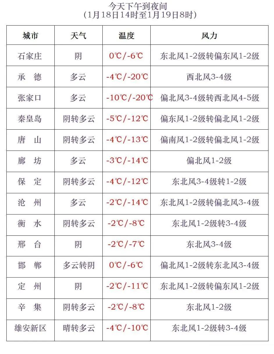 今天下午到夜间,保定、石家庄、邢台、邯郸四个地区的西部和沧州东部、衡水东部阴有小雪或零星小雪,个别地点有中雪;其他地区多云间阴。最高气温,张家口、承德大部、保定西北部-23~-6℃,其他地区-5~0℃。最低气温,张家口、承德、秦皇岛北部、保定西北部-35~-16℃,其他地区-15~-5℃。