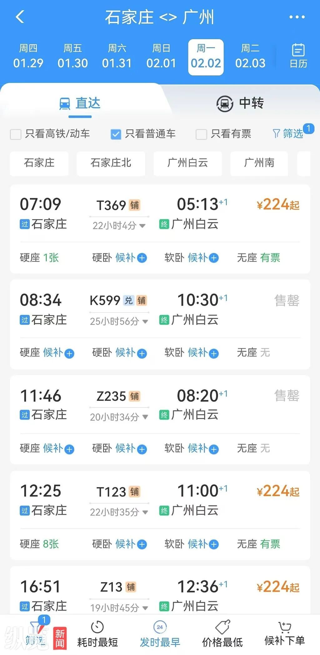 1月20日上午,记者查询2月2日从石家庄开往广州的车票情况。(来源/12306截图)