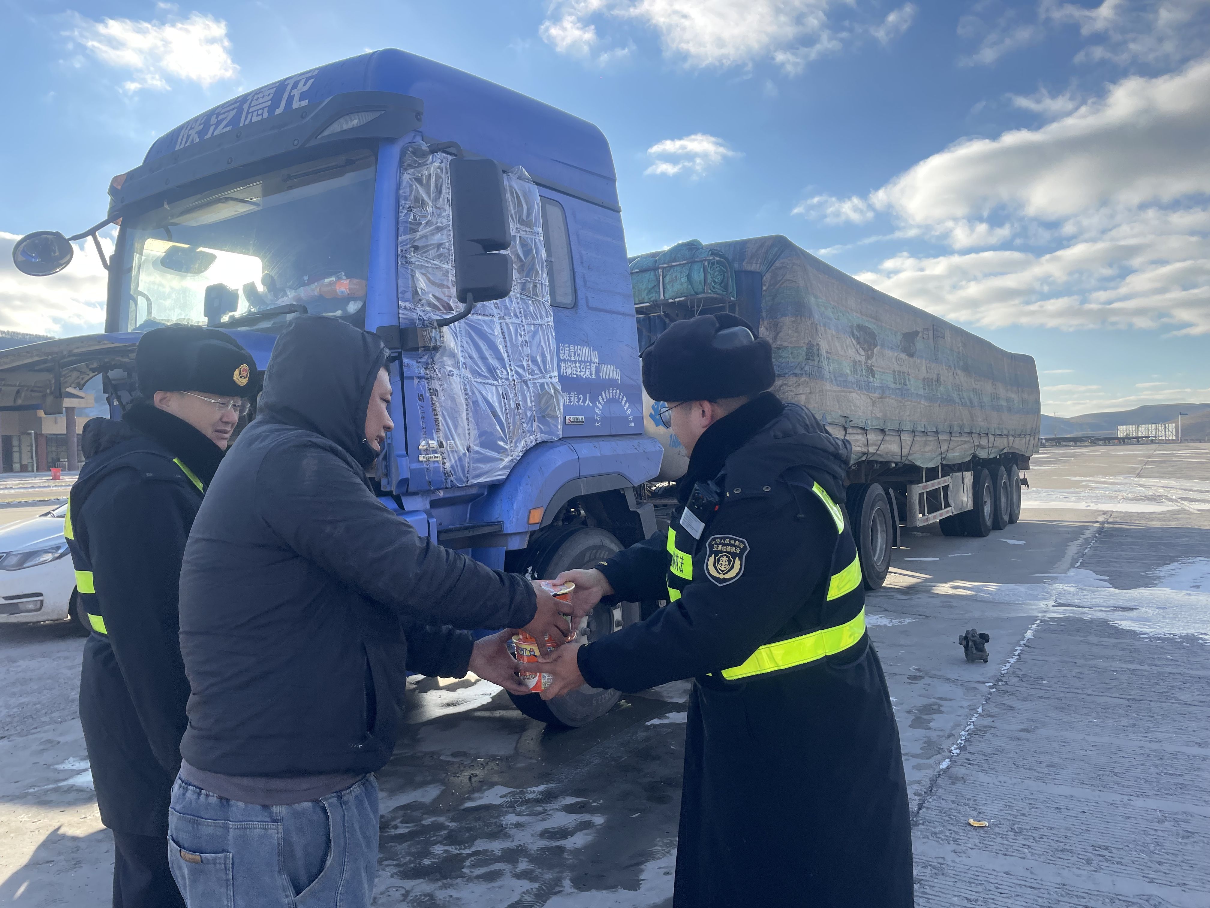针对部分路段因降雪实施临时交通管制导致车辆滞留服务区的情况,执法人员主动为司乘人员提供热水、泡面等应急物资,并向他们普及雪天行车技巧,耐心解答出行信息疑问,缓解司机师傅的焦虑情绪。
