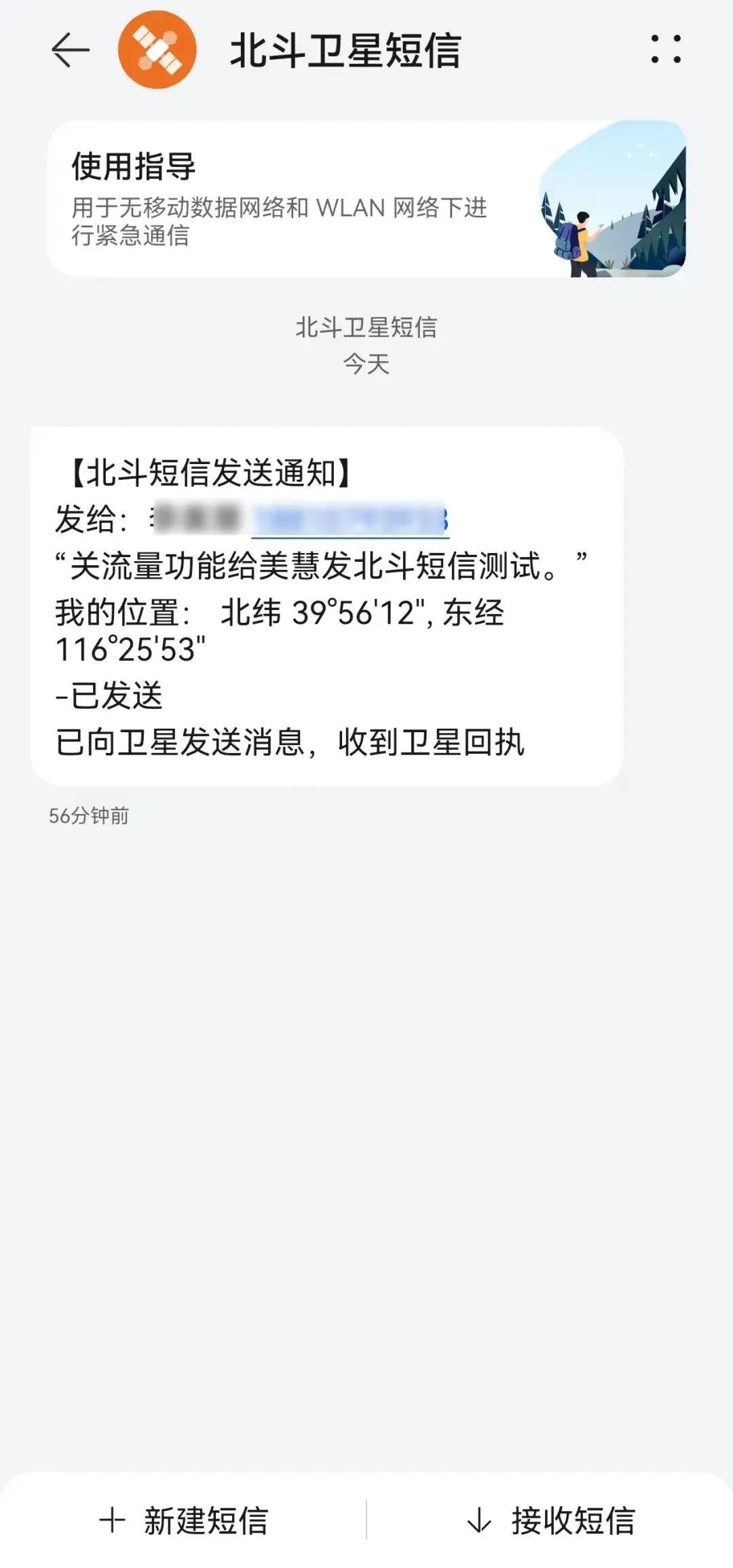 此外,为保障通信畅通,中国移动为北京用户提供为期一个月的免费北斗短信服务(发送30条,接收无限制),如果用户有支持北斗短信功能的手机,可以在户外无移动通信网络信号时收发应急短信,使用方式如下: