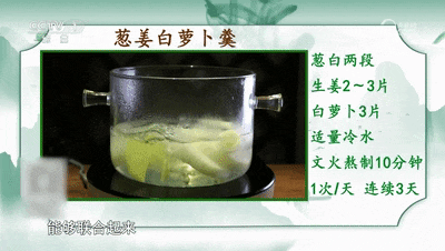 葱白两段、生姜2~3片、白萝卜3片、适量冷水,文火熬制10分钟,建议每天1次,连续服用3天。