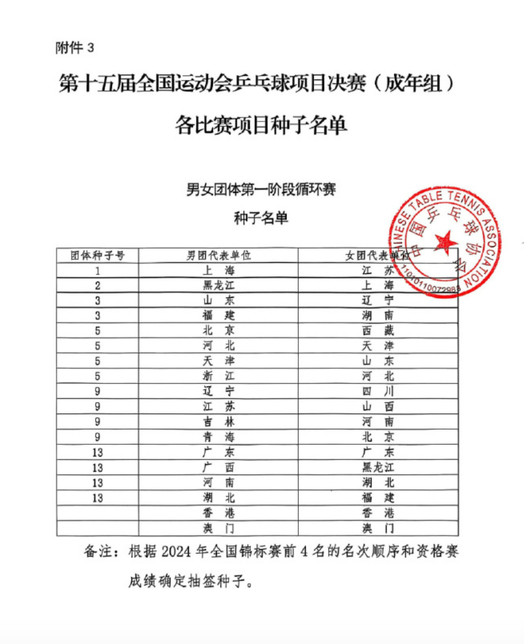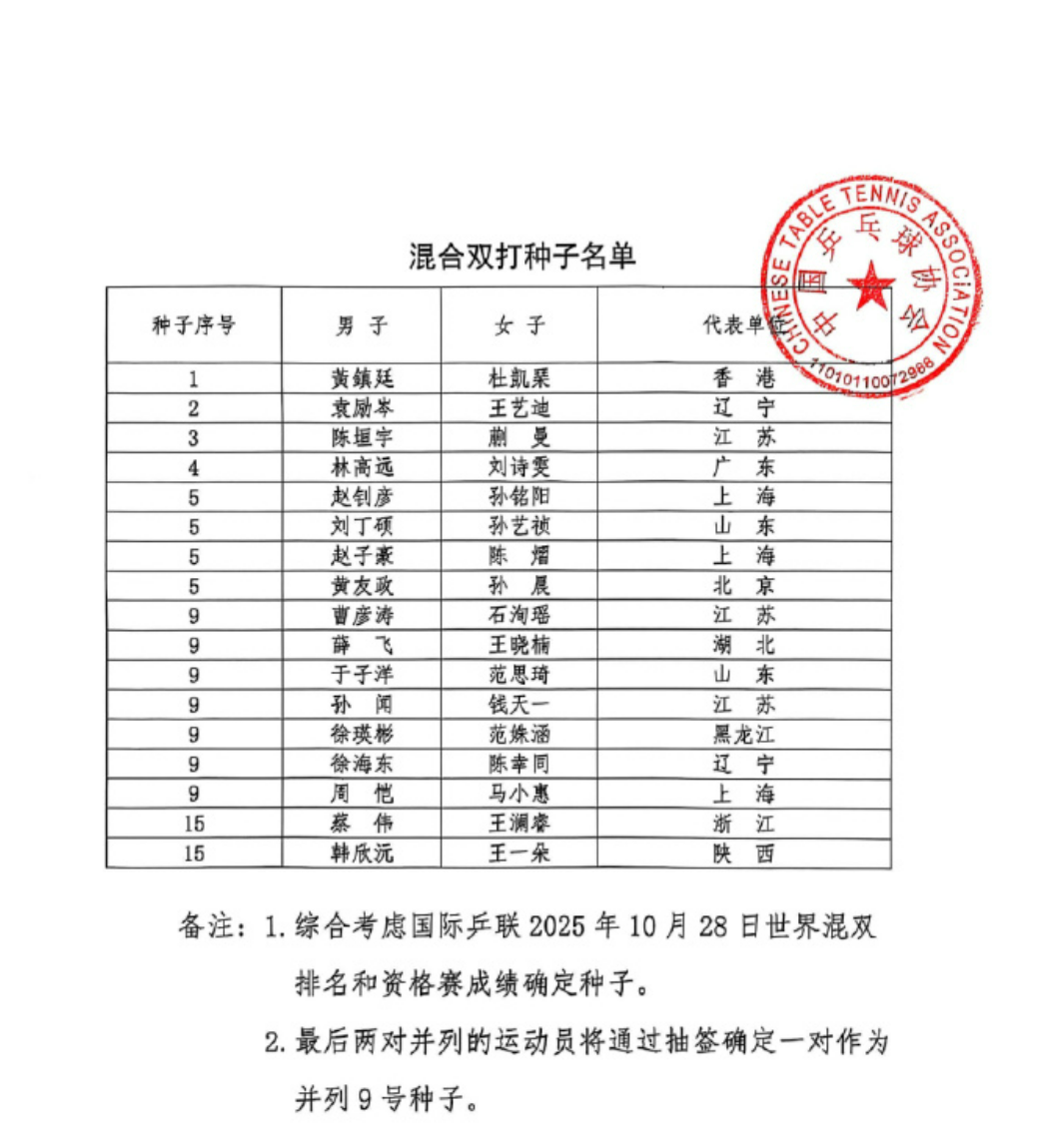 中国乒乓球协会公示第十五届全国运动会乒乓球项目决赛种子,成人组男子王楚钦列为1号种子,女子孙颖莎为1号种子。