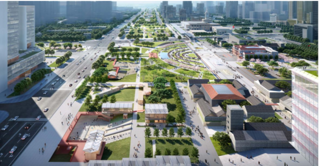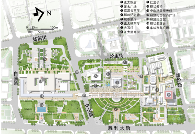 设计方案通过弧形构图的绿化休闲广场,将正太饭店、大石桥、解放纪念碑区域空间秩序进行了整合,引入“车站市集”理念对石家庄解放纪念馆东立面和东广场进行了提升设计,同时强化了广场的南北轴线,通过站台、过街天桥、历史文化轴线、红盒子等一系列的轴线空间将解放纪念馆东广场和正太广场串联、统合,加强了两个广场的连通互动,形成完整的城市广场。