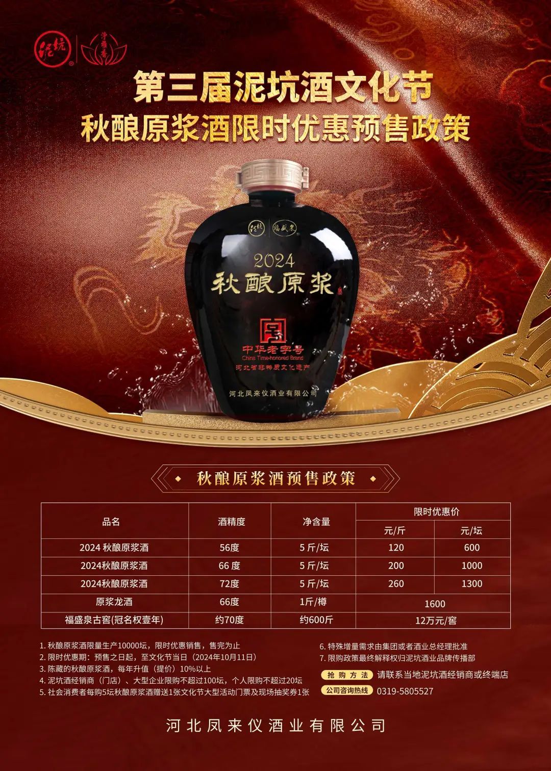 2024泥坑秋酿原浆酒限量生产10000坛,限时优惠销售,售完为止。从即日起开始预售,截至文化节当日(2024年10月11日)。