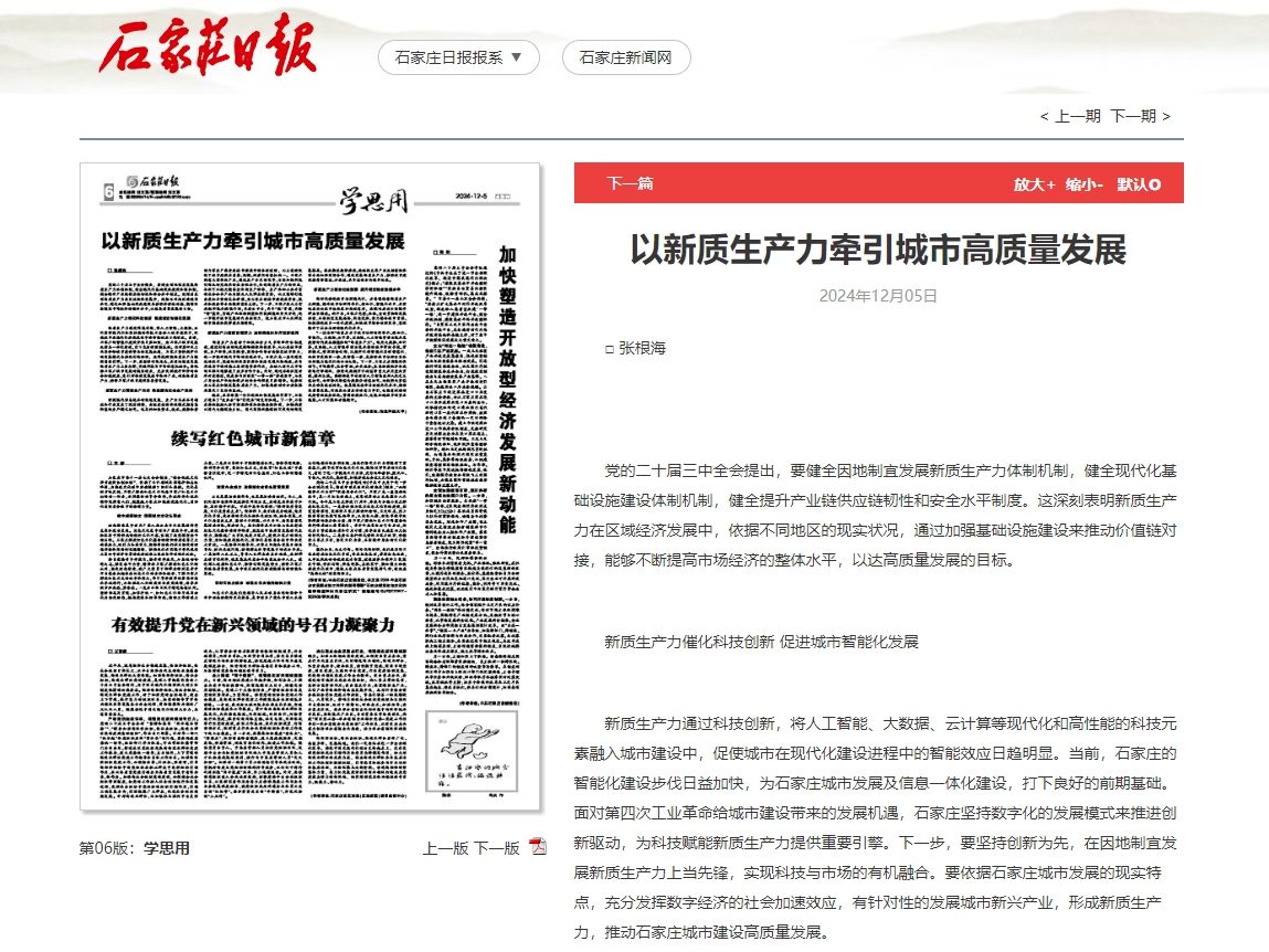 新时代推进城市治理现代化,应着眼依靠新质生产力赋能,提升城市治理科学化、精细化、智能化水平,在宏观层面让城市运转更加高效有序,在微观层面不断提升群众幸福感。近年来,石家庄完整、准确、全面贯彻新发展理念,不断拓宽发展思路,锐意进取,努力整合城市资源、积极推进城乡一体化建设、加快城市综合治理改革,有效提升了社会治理的现代化水平。