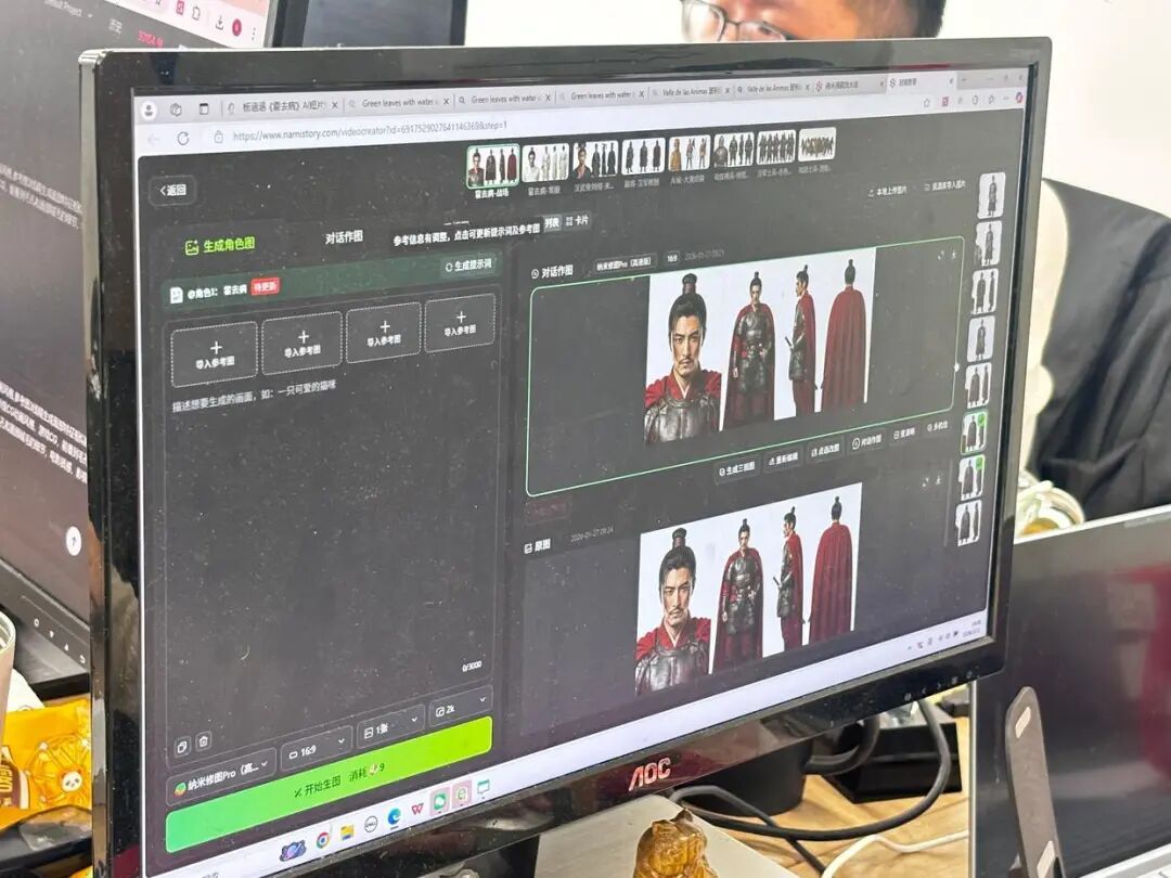 杨涵涵的公司目前有20人的团队,主力成员为“00后”,其中包含杨涵涵在内的3人负责短剧《霍去病》的制作。他们耗时4天,平均每天工作12小时。在48小时的制作周期内,这3人团队分别负责导演、编剧、分镜、AI生成、剪辑、音乐音效等多个板块。