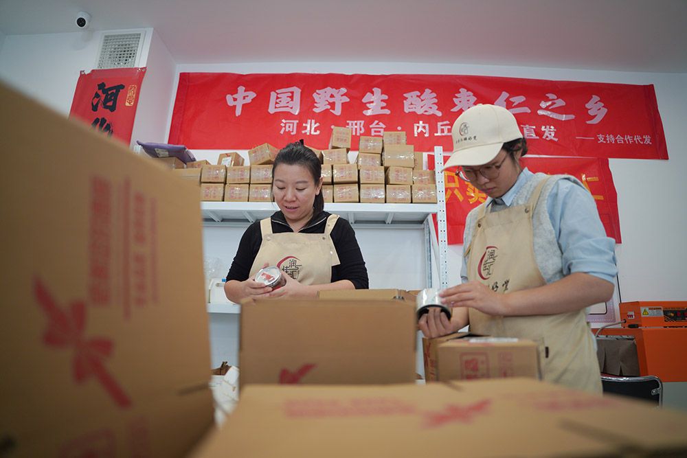 ↑11月6日,在内丘县一家酸枣仁购销中心,工作人员在打包商品。