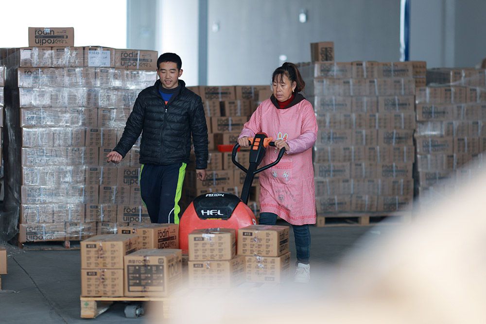 ↑11月6日,在内丘县智慧云仓,工作人员在装运货物。