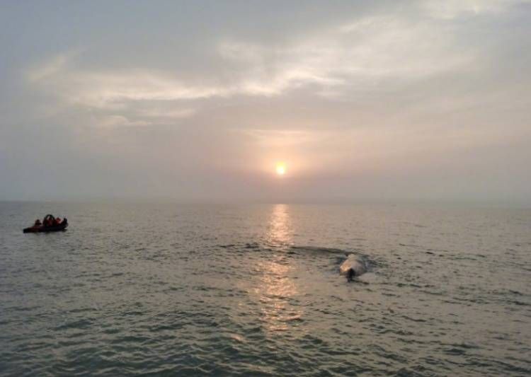 22时左右,潮水基本覆盖鲸的身体,七艘船抵达事发海域,通过缓慢拖拽的方式再次试图将它拖回海中,这一次,它慢慢地跟随绳索向深海游去。