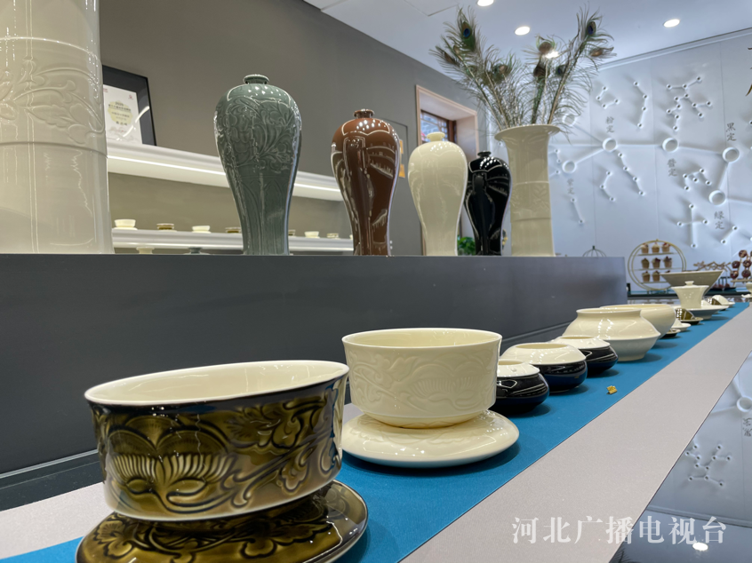 二号展厅是国家级定瓷非遗传承人——薛兴嶙老师的弘传定瓷语言馆。薛老师的创作核心是“师古而不泥古,师自然而与时俱进”,将传统与时代融会贯通。其代表作品为高温瓷“感恩杯”,意在诠释“滴水之恩,当涌泉相报”。北面北斗九星阵图诠释了薛老师九年来对定瓷古代釉色系统解密的科研成果一一九大色系(天目釉丶秘色青黄釉、粉定、紫定、黄定、绿定、灰定、酱定、黑定)