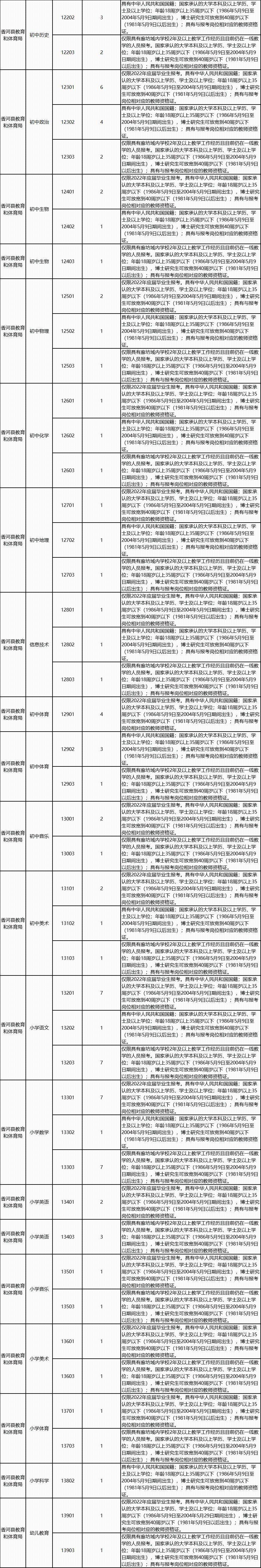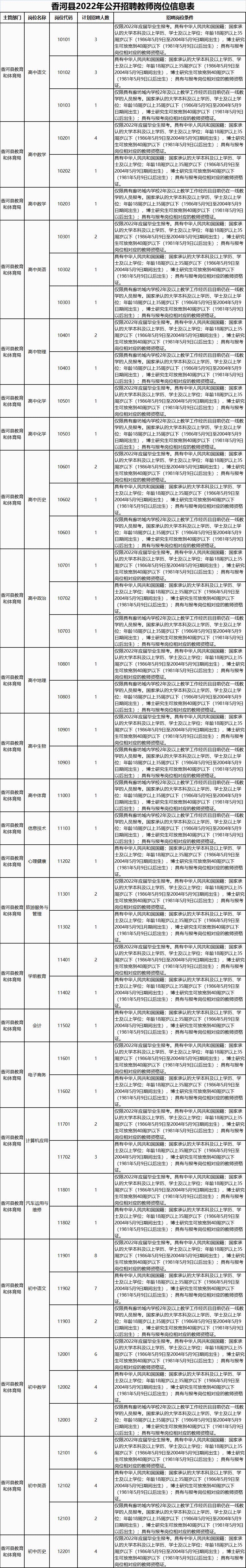 香河县2022年教育系统面向社会公开招聘教师190名,具体招聘岗位及名额详见《香河县2022年公开招聘教师岗位信息表》(附件1)。