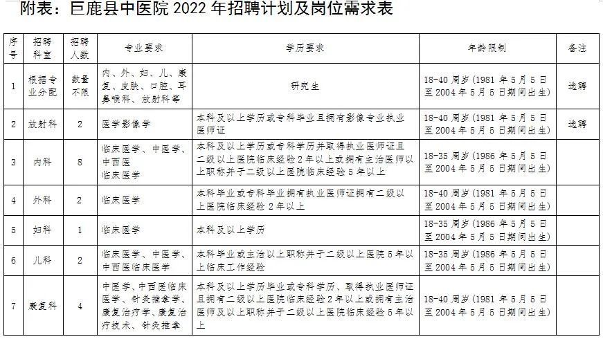 具体招聘岗位及条件详见《巨鹿县中医院2022年招聘计划及岗位需求表》附表。