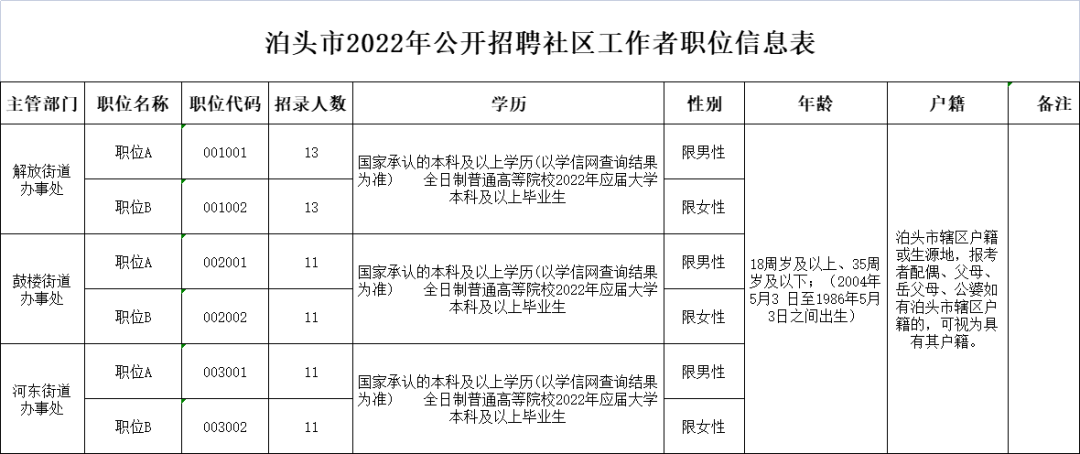 此次公开招聘社区工作者70名。招聘岗位、招聘人数、招聘岗位条件等详见《泊头市2022年公开招聘社区工作者岗位信息表》(附件1)。