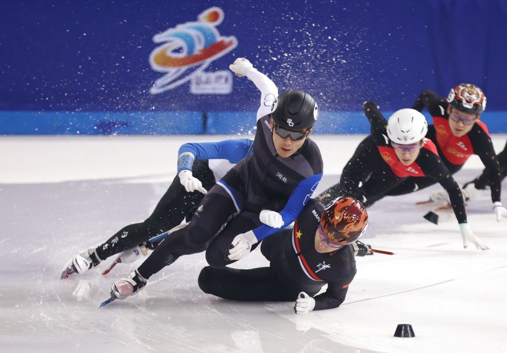 ↑9月26日,天津市冬季和水上运动管理中心选手刘少昂(前左)在男子甲组1500米首轮比赛中与其他选手发生碰撞。他最终被判进半决赛。