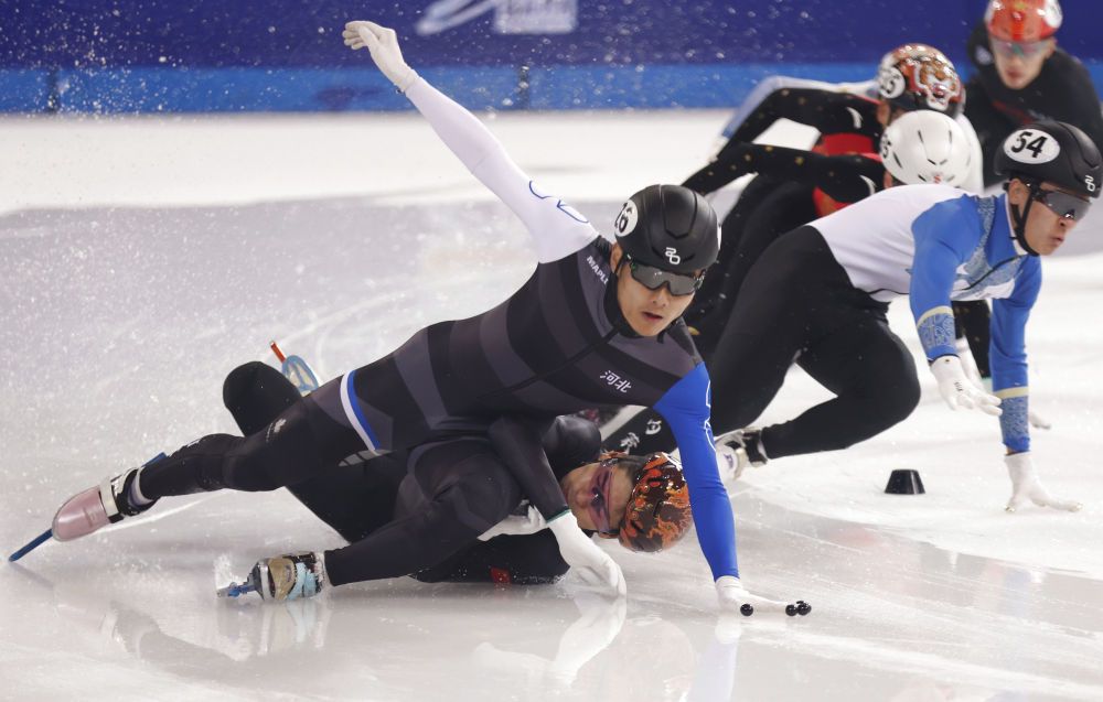 ↑9月26日,天津市冬季和水上运动管理中心选手刘少昂(前左)在男子甲组1500米首轮比赛中摔倒。他最终被判进半决赛。