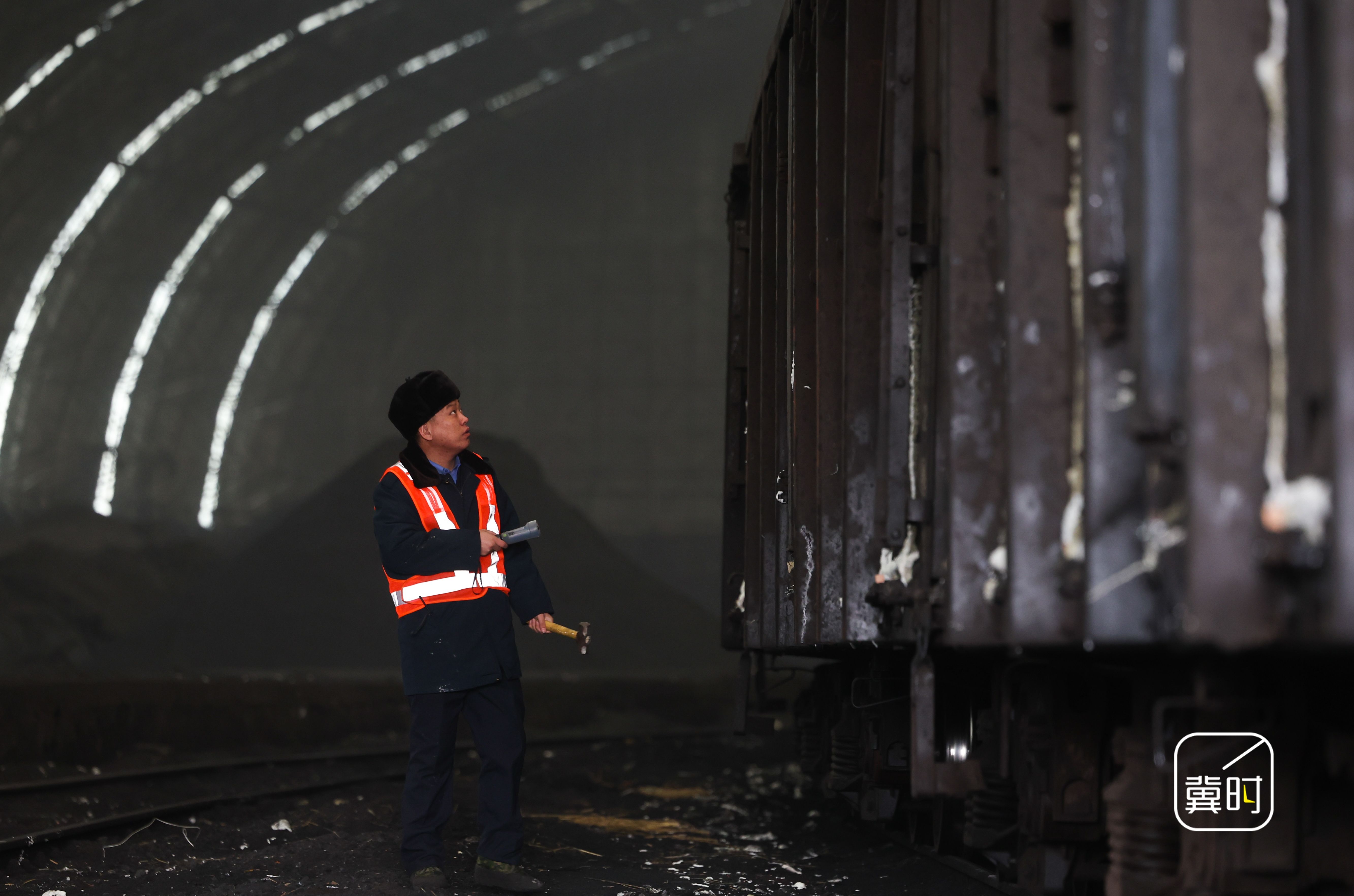 2026年2月17日,在河北省石家庄中联铁运(井陉)煤炭储备基地,石家庄铁路物流中心井陉营业部工作人员对煤运列车进行巡查。