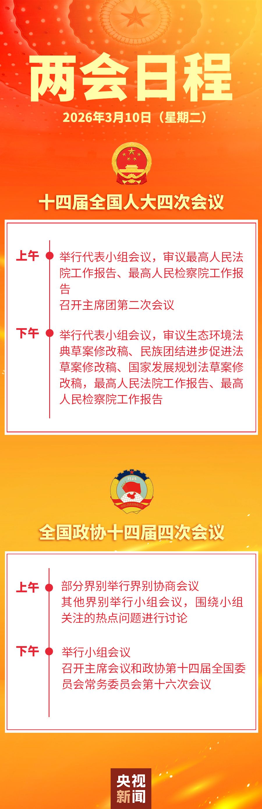 十四届全国人大四次会议10日上午举行代表小组会议,审议最高人民法院工作报告、最高人民检察院工作报告;召开主席团第二次会议。