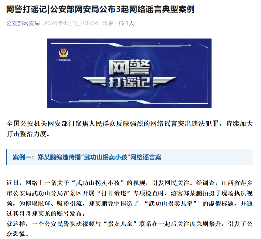 原标题:网警打谣记|公安部网安局公布3起网络谣言典型案例
