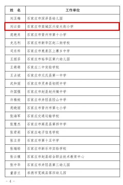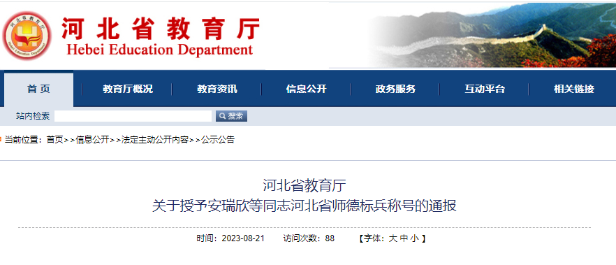 河北省教育厅最新发布关于授予安瑞欣等同志河北省师德标兵称号的通报,选树安瑞欣等400名同志为2023年河北省师德标兵,授予省师德标兵称号,其中,我区兴安大街小学教师刘云茹光荣上榜↓↓↓