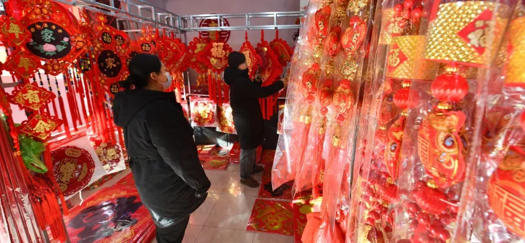 (商家在向居民展示新春饰品)