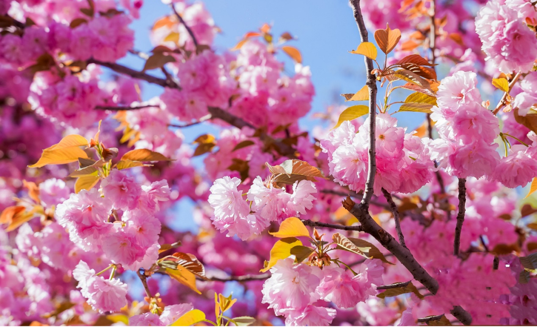 樱花季、海棠季,正值繁花盛放期,花团锦簇,缀满枝头。朱红的花蕾、粉红的花瓣、明绿的新叶,在阳光映照下,花朵熠熠生辉;春风拂过,娇柔的花瓣轻舞飞扬,一场粉色花瓣雨,令人陶醉其中,流连忘返。