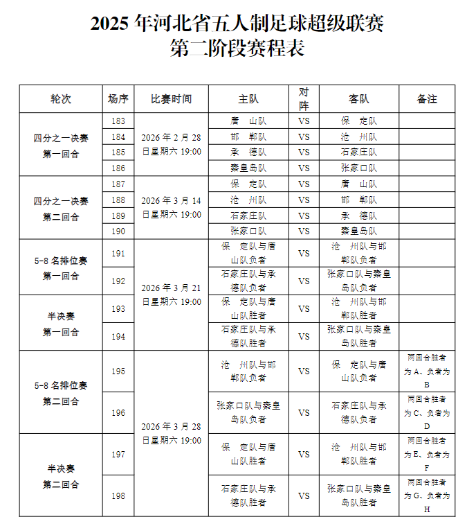 2月12日,2025年河北省五人制足球超级联赛组委会发布通知,正式印发《中国银行2025年河北省五人制足球超级联赛第二阶段赛程表》,明确季后赛阶段全部赛程安排与竞赛规则。