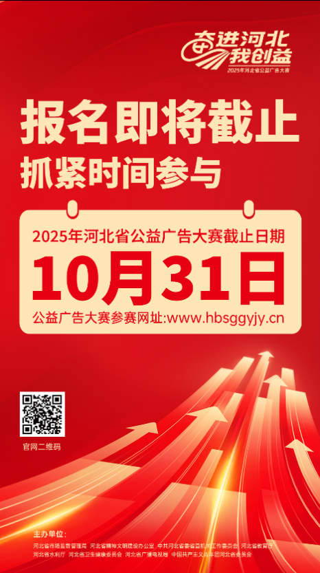 2025年河北省公益广告大赛由河北省市场监管局、河北省文明办、河北省委省直工委、河北省教育厅、河北省水利厅、河北省卫生健康委、河北省广播电视局、共青团河北省委共同举办,广泛征集一批专业性、思想性、文化性、艺术性俱佳的公益广告作品,将于10月31日截止投稿!