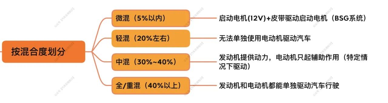 而按电机驱动功率占整车功率的比例(即混合度),可划分为:微度混合、轻度混合、中度混合和重度/全混合。