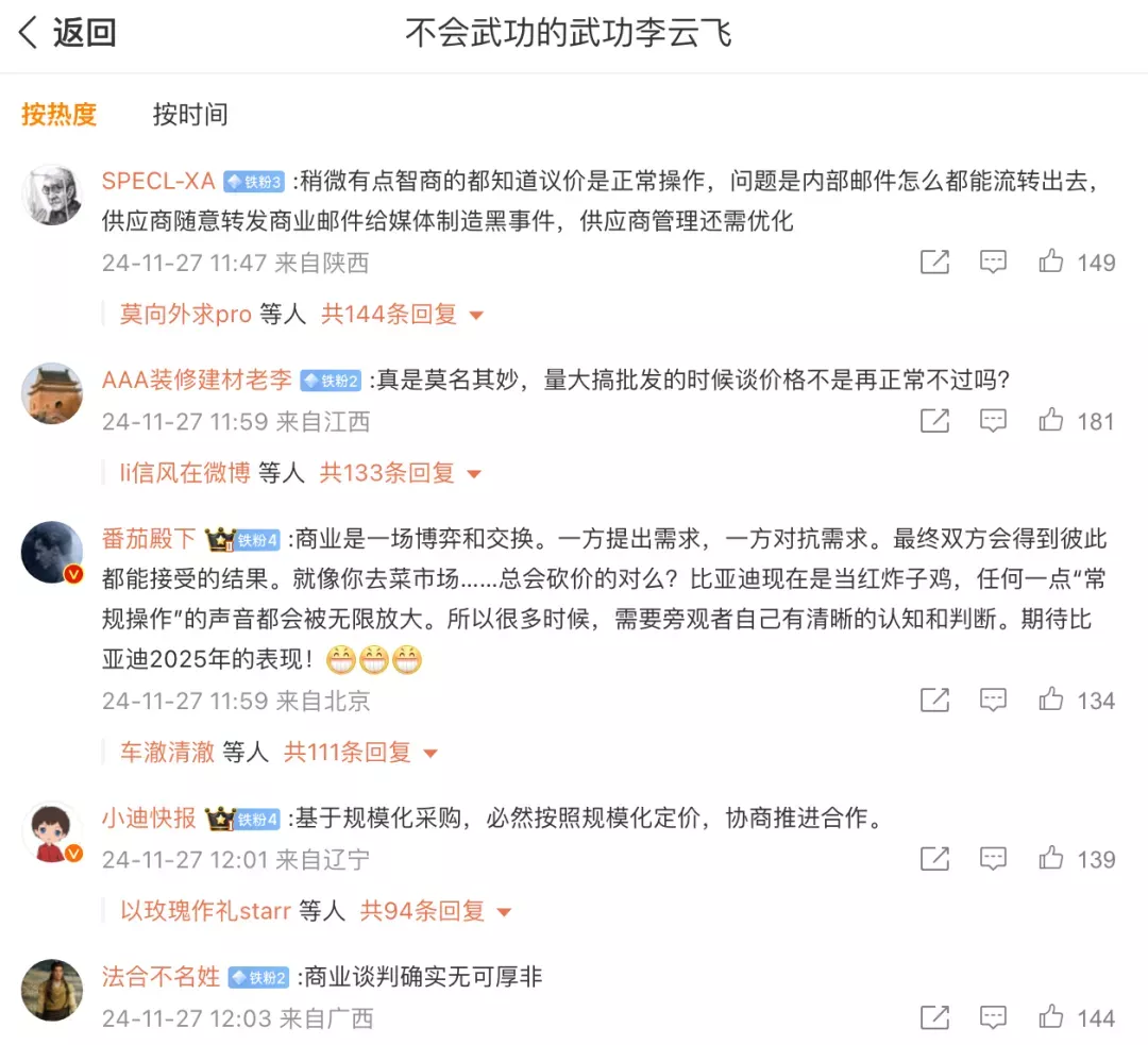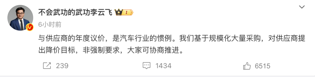 针对“比亚迪要求供应商降价10%”消息,11月27日午间,比亚迪集团品牌及公关处总经理李云飞在微博紧急发文回应:“与供应商的年度议价,是汽车行业的惯例。我们基于规模化大量采购,对供应商提出降价目标,非强制要求,大家可协商推进。”
