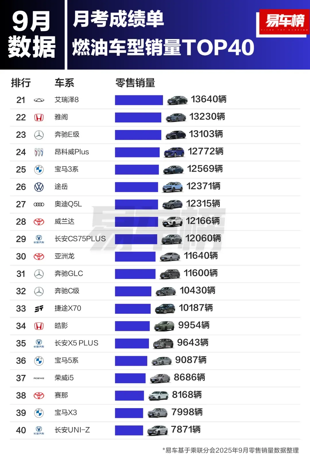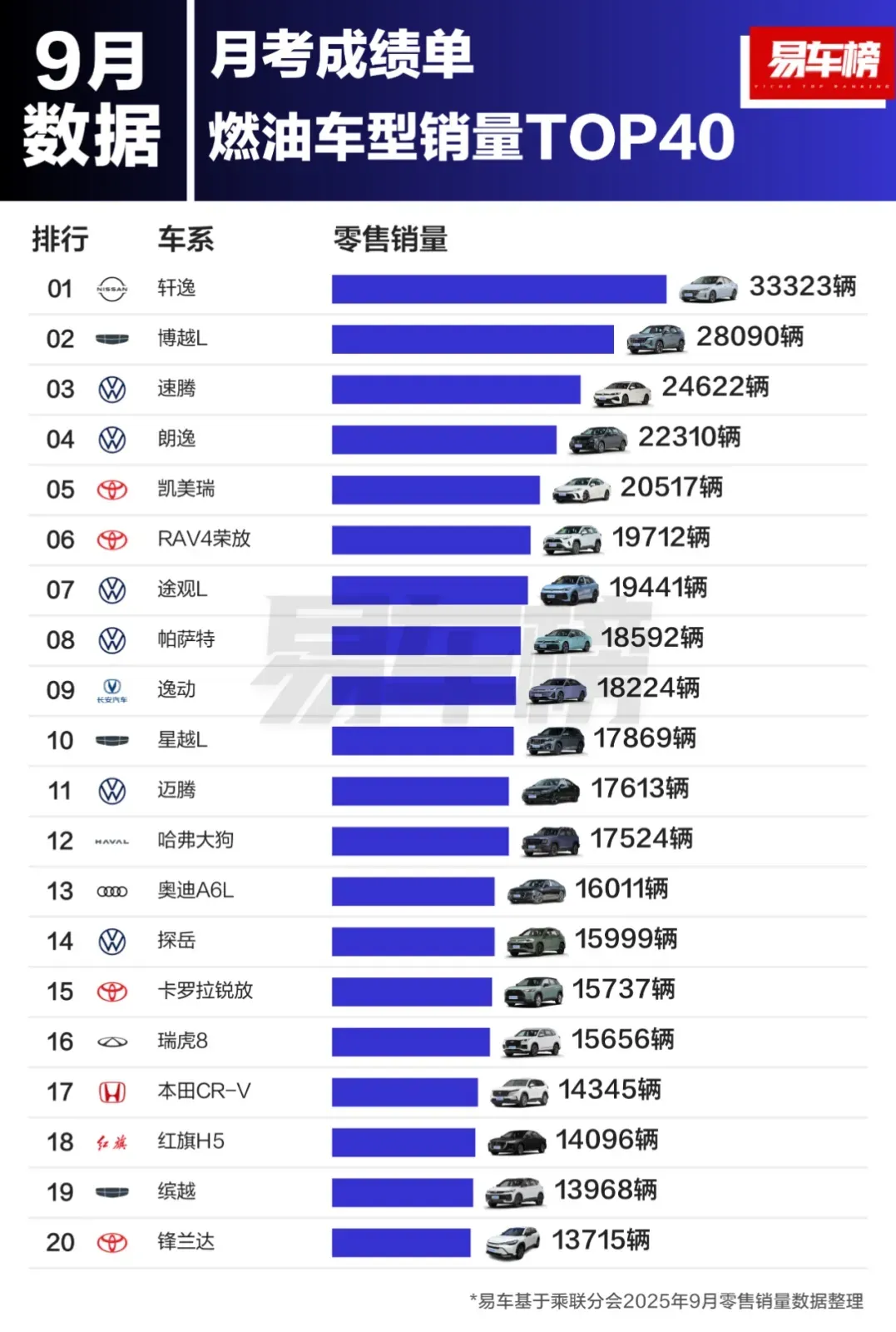 依据易车发布的燃油车型销量数据显示,9月共有33款燃油车型零售销量超万辆,其中轩逸超3万辆;博越L、速腾、朗逸、凯美瑞四款车型销量均超2万辆。