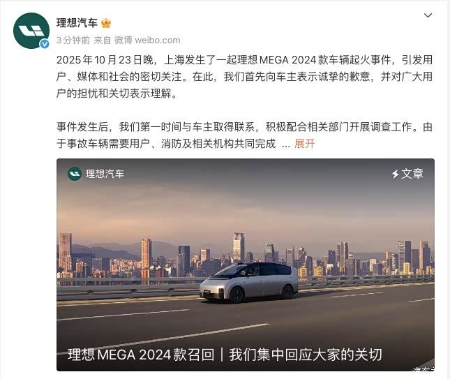 2025年10月23日晚,上海发生了一起理想MEGA 2024款车辆起火事件,引发用户、媒体和社会的密切关注。在此,我们首先向车主表示诚挚的歉意,并对广大用户的担忧和关切表示理解。