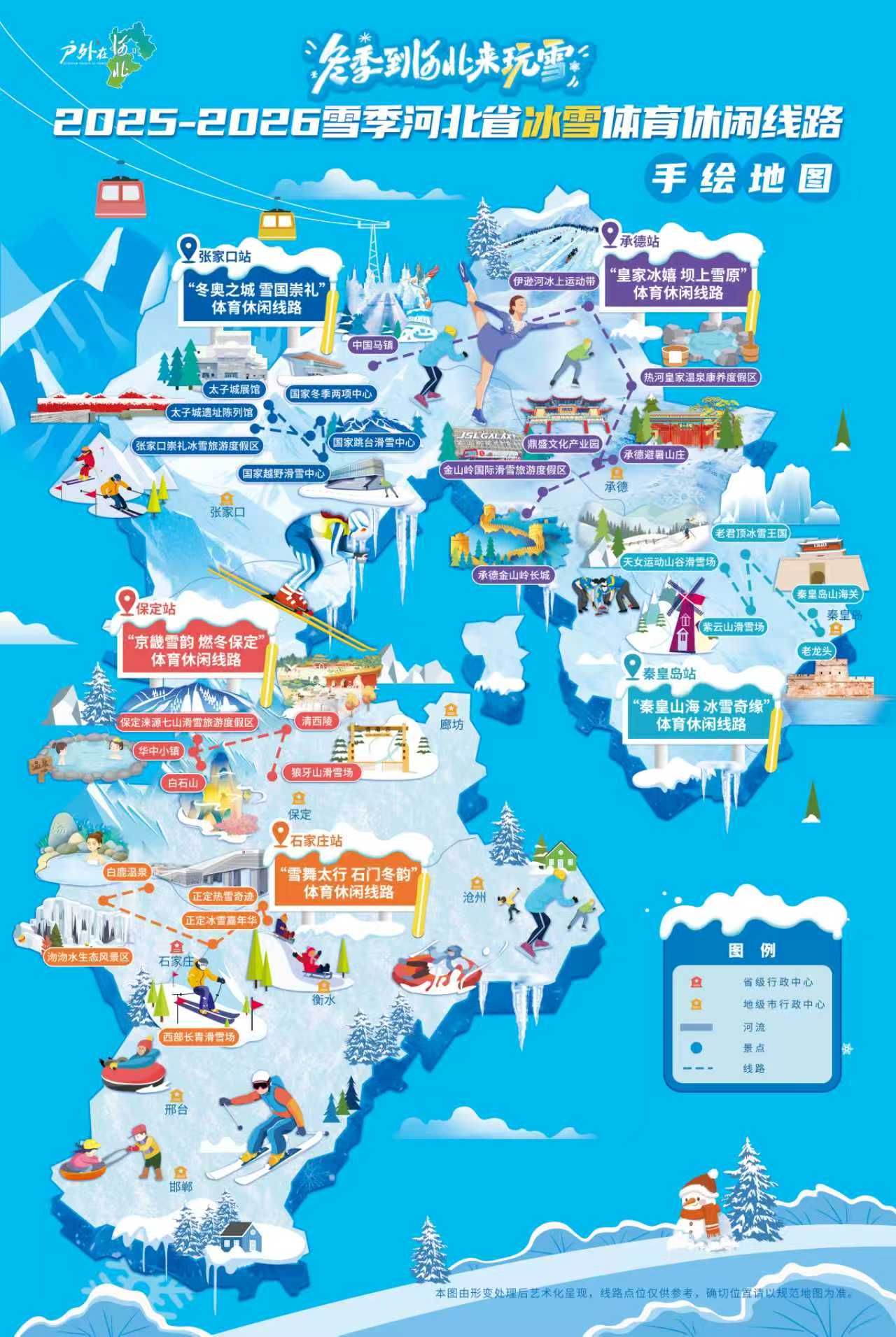 其中,石家庄市举行研学冬令营、“冰雪过大年”亲子运动会等冰雪休闲活动;承德市举行2025-2026“皇家冰雪 龙腾热河”户外运动季、承德冰嬉大典、“山滦骑遇·踏雪寻冬”系列雪骑活动、木兰围场冬捕冰钓等冰雪休闲活动;张家口市举行大众冰雪研学季、雪上定向狂欢节、康巴诺尔冰雪嘉年华,以及雪地电音节、冰雪主题微短剧等冰雪休闲活动;秦皇岛市举行“秦皇岛之冬·欢乐冰雪季”冰雪嘉年华系列活动,涵盖万人雪地拔河、万人滑雪和紫云山夜滑体验等冰雪休闲活动;保定市举行中国·保定(涞源)冰雪户外运动大会、“浪漫冰雪 爱在保定”冰雪运动嘉年华系列活动,各区县同步推出冰雪运动会、滑雪比赛及戏雪活动等冰雪休闲活动。“雪舞太行 石门冬韵”“皇家冰嬉 坝上雪原”“冬奥之城 雪国崇礼”“秦皇山海 冰雪奇缘”“京畿雪韵 燃冬保定”等5条冰雪体育休闲线路各具特色,带领广大冰雪运动爱好者尽享“冰雪+温泉”“冰雪+演艺”“冰雪+民俗”“冰雪+美食”的冬日狂欢。