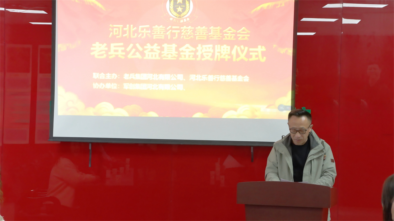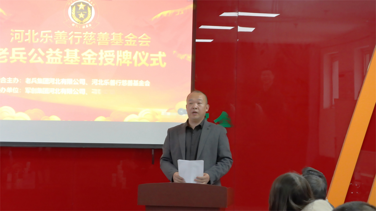 随后,河北乐善行慈善基金会理事长左立飞致辞,详细介绍了基金会的公益理念及老兵公益基金的运作模式。他表示:基金会始终聚焦民生关切、践行社会责任,此次设立老兵公益基金,是响应国家号召、关爱退役军人的重要举措。基金会将严格履行监管职责,规范基金管理流程,确保每一笔善款都用在刀刃上,与老兵集团一道,为老兵提供有温度、有力度的公益支持,共同推动关爱老兵事业规范化、长效化发展。