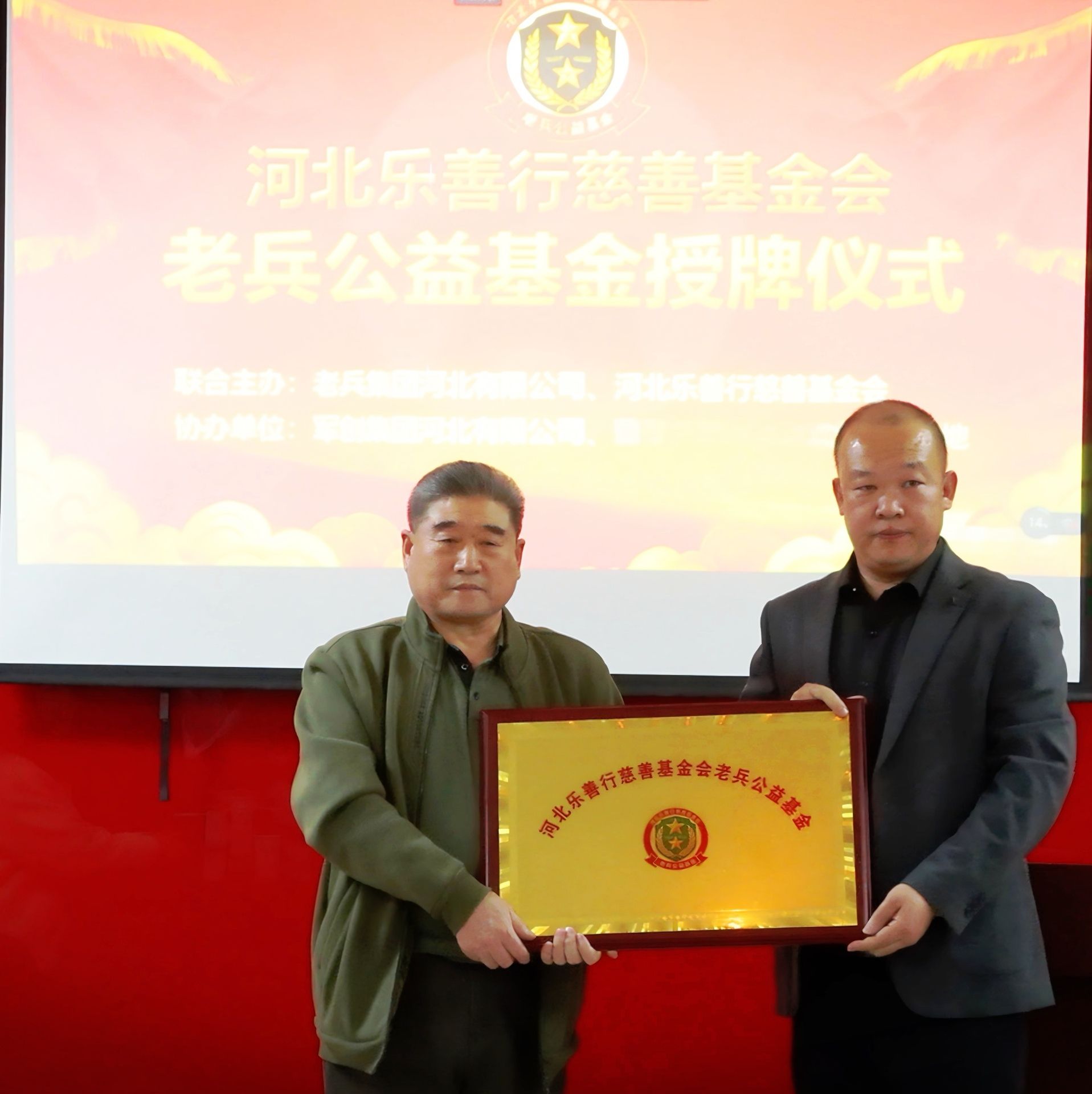 致辞结束后,授牌环节正式举行。在全场嘉宾的见证下,河北乐善行慈善基金会理事长左立飞亲手将“河北乐善行慈善基金会老兵公益基金”牌匾授予老兵公益基金相关负责人于占全;牌匾的交接象征着公益使命的传承,标志着关爱老兵公益事业迈入资源整合、协同发力的新阶段。