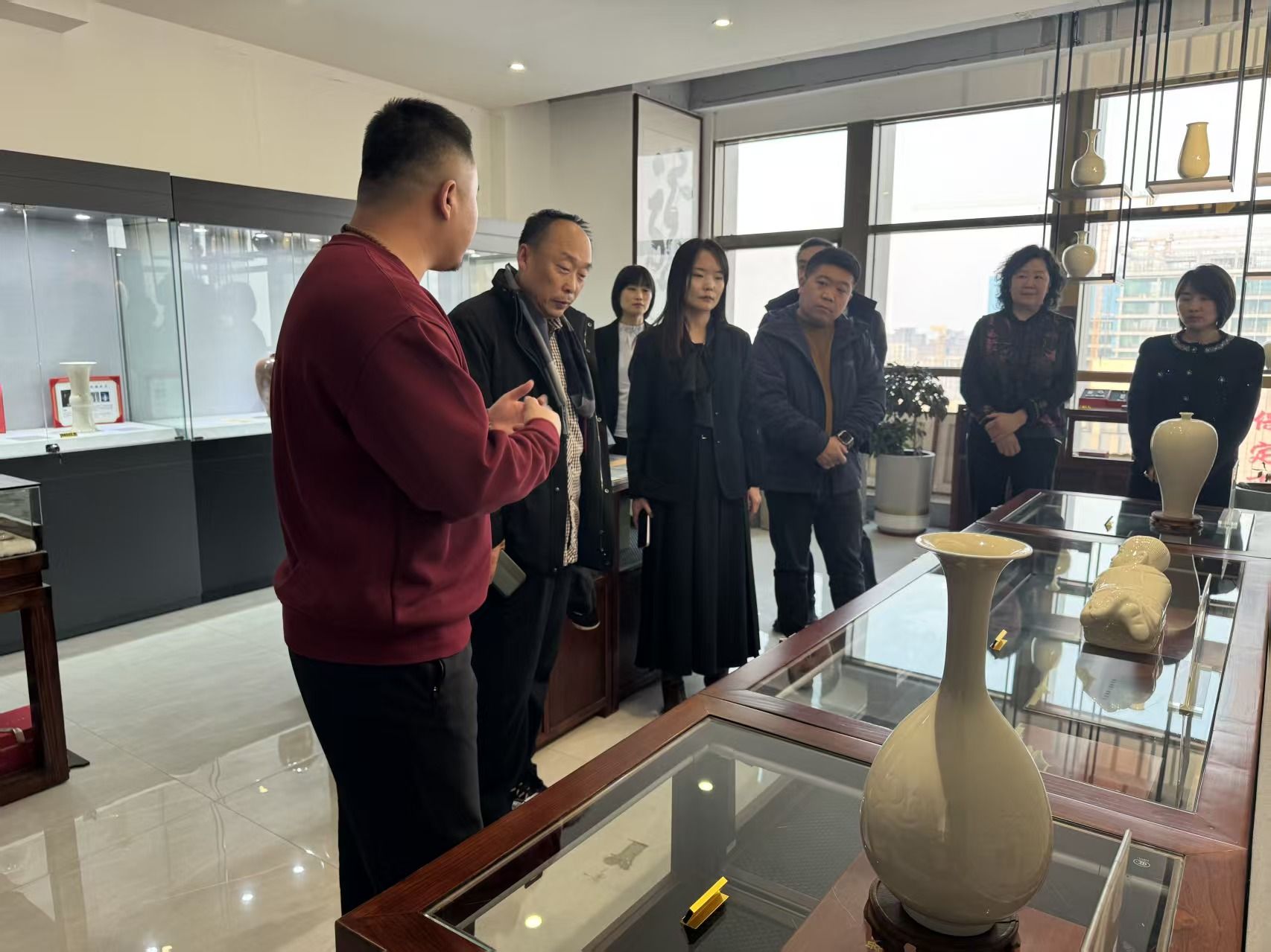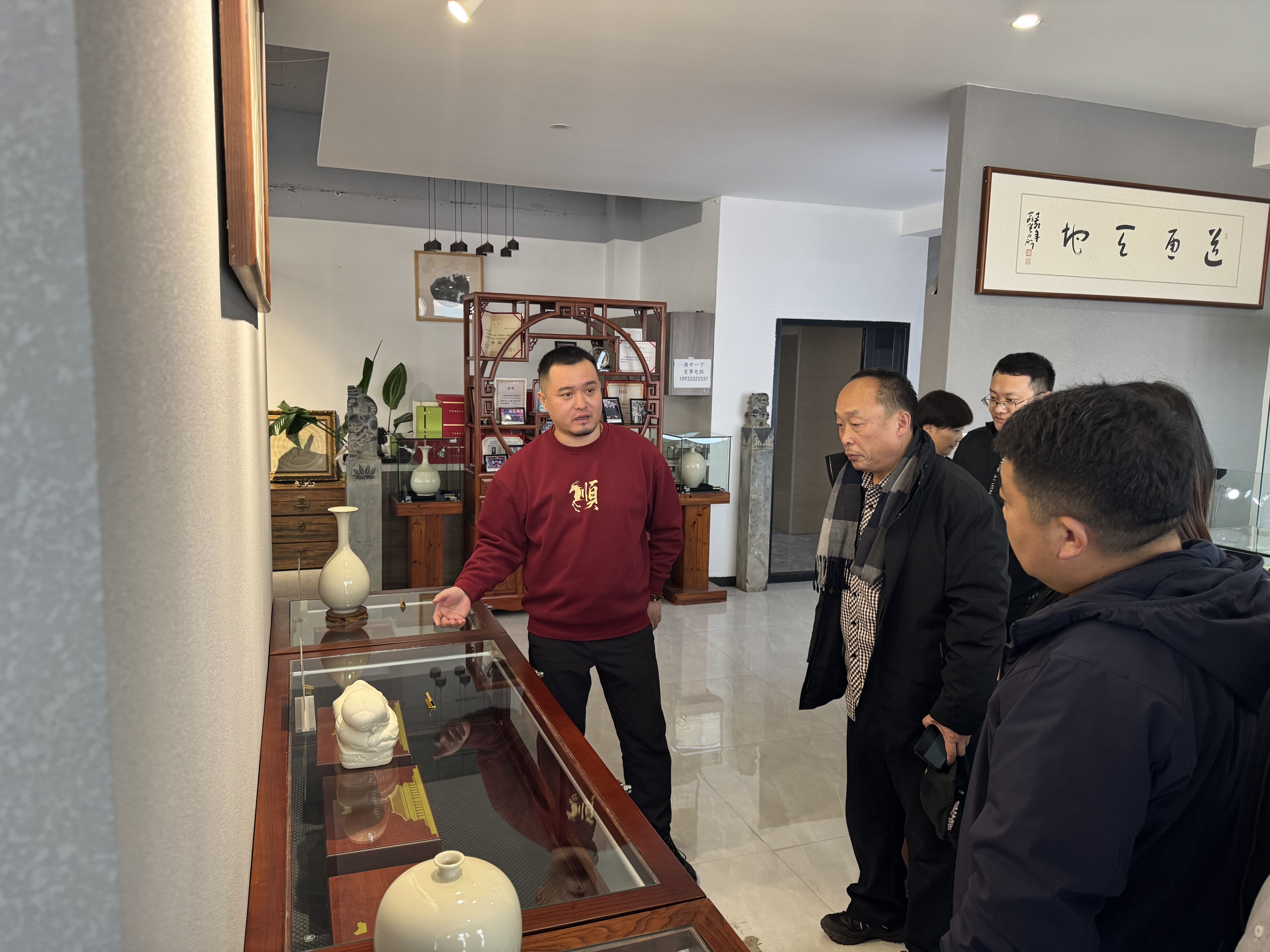 一行人第二站来到缸北窑展厅,这里展出了王勰先生创新的一系列定窑文创产品,这些产品既坚守传统又独具创新,深受磁州窑专家们的赞誉。