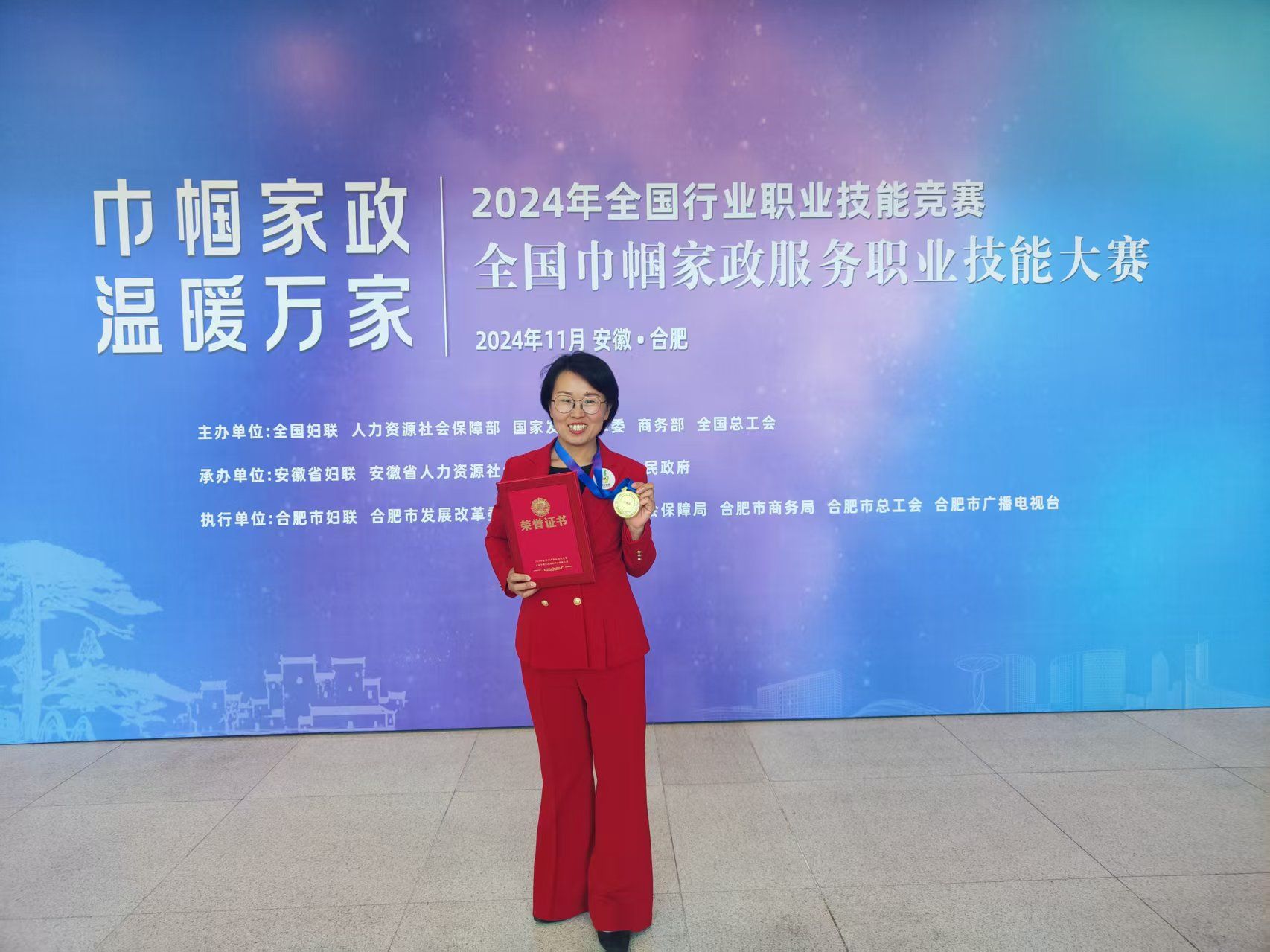 虽然压力很大,但是她不敢有丝毫松懈,她知道,每多练一次,心里就多一分踏实。2024年11月,李军田奔赴合肥,站上了全国巾帼家政服务职业技能大赛的赛场。现场高手云集,年轻的九零后面孔让她深感家政行业新生力量的蓬勃,也激发了她的斗志。理论笔试,她沉着应对;实操环节,面对偌大的赛场、成排的评委和镜头,最初几秒的紧张迅速被日复一日锤炼出的肌肉记忆和专业自信取代,凭借着出色表现脱颖而出,荣获家务服务员项目三等奖,为河北争得了荣誉。