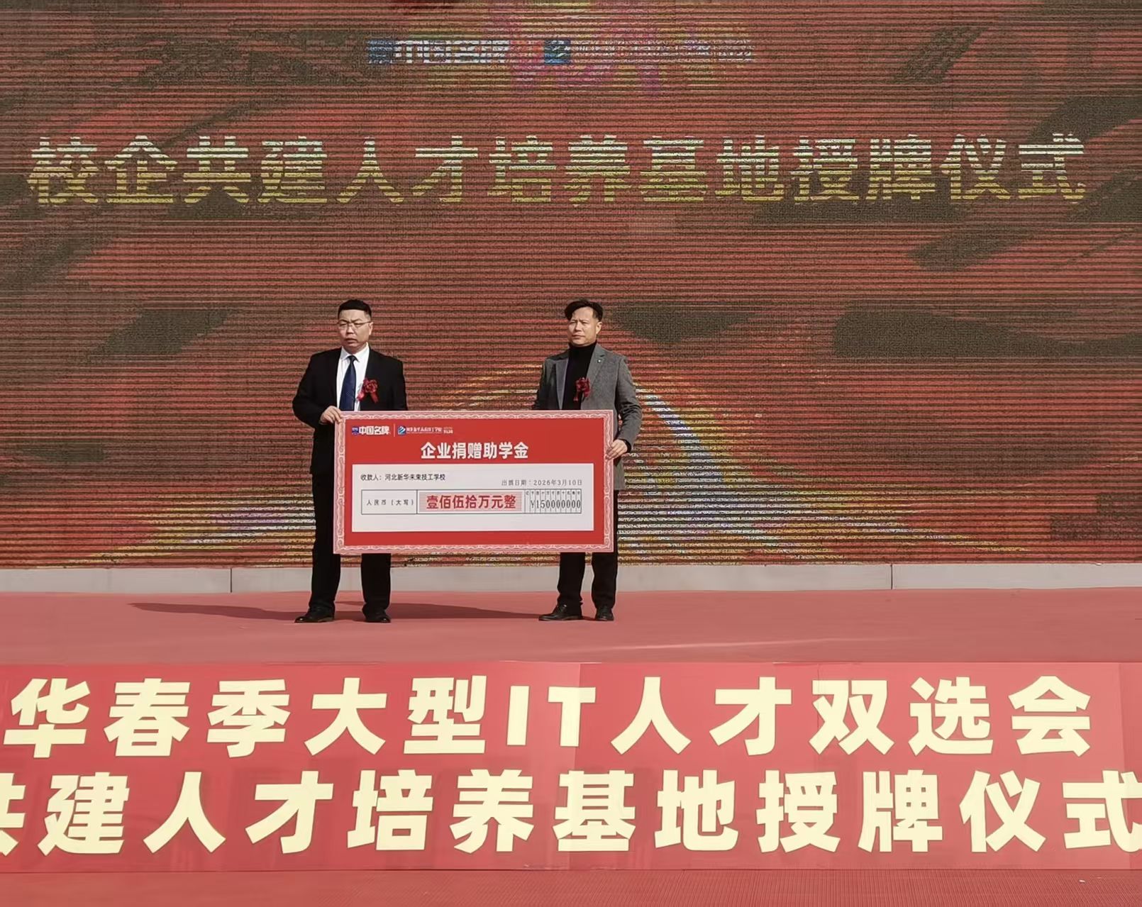 授牌后,河北三齐文化传媒有限公司向学校捐助助学金,董事长陈文寿表示,企业发展离不开人才,助学金是履行社会责任的体现,助力学子成长,同时期待深化校企合作,共促数字经济发展。