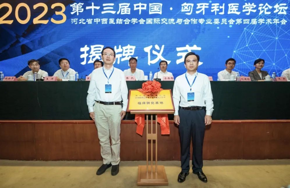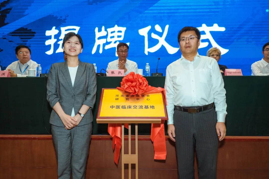 华北理工大学副校长齐西伟、迁安市副市长焦燕为“河北省国际联合研究中心中医临床交流基地”揭牌。